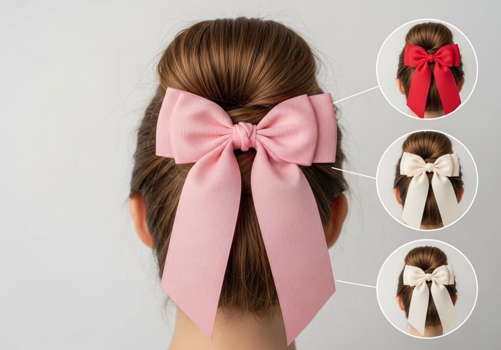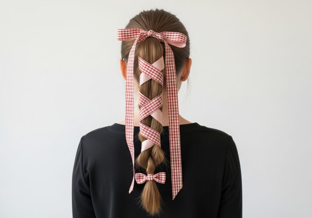Scroll through any girlie’s Pinterest board right now and you will see bow updos everywhere. This is one of the most requested cute hairstyles for girls in 2026. A high bun or ponytail finished with a satin ribbon tied into a big, floppy bow looks incredibly romantic and feminine. Pink, red, and ivory bows are the top favourites right now.