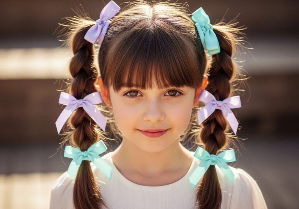Low pigtail braids sitting just behind the ears are one of the most effortlessly cute hairstyles for girls that never goes out of style. Simple, sweet, and completely easy to do at home. Add a tiny scrunchie or ribbon at the end of each braid to elevate the whole look. This style works beautifully on every hair texture.