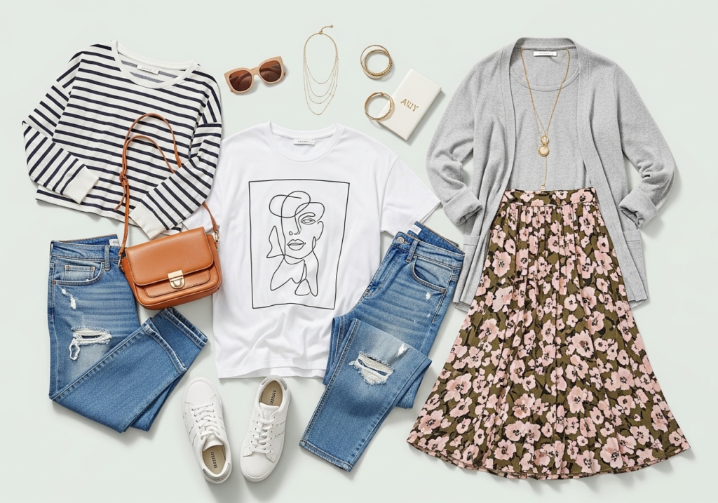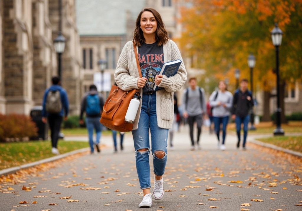 For college, go for comfy yet stylish pieces like jeans, graphic tees, and sweatshirts, paired with cute accessories.
