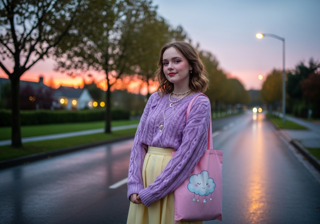 - Think soft girl looks with pastel colors, oversized sweaters, and skirts.